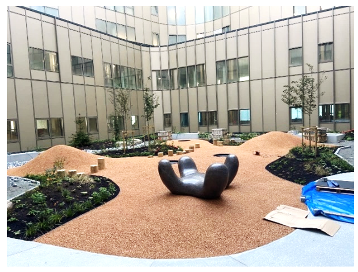 For barn bør det være lekeområder. Nye SUS har planlagt for barnepoliklinikk og dagområde i 1. etasje. Her er det lagt til rette for skolearealer i samme området, samt lekearealer både ute og inne. KORO (kunst i offentlige rom) vil utsmykke arealene med kunst tilpasset barn.
