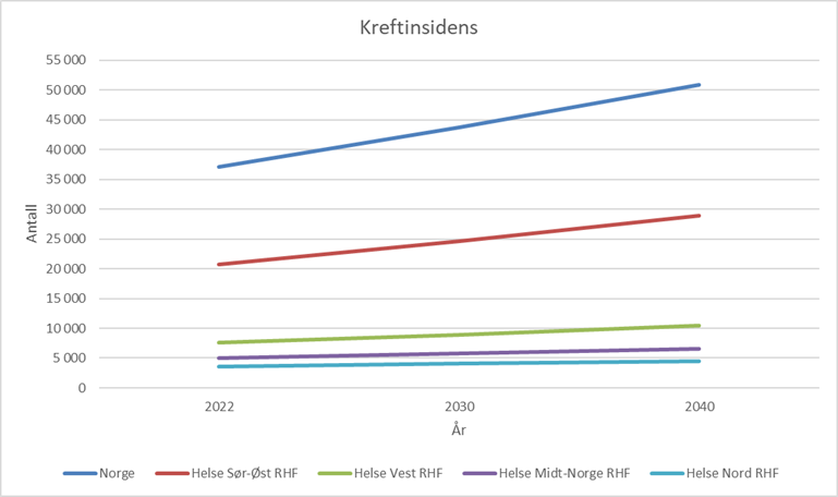 Ifølge Kreftregisteret var det 38.265 nye krefttilfeller i 2022Kreft i Norge. Kreftregisterethttps://www.kreftregisteret.no/Temasider/om-kreft/.Prostata-, bryst-, lunge- og tykktarmskreft er de vanligste kreftformene, og utgjør til sammen 50 prosent av alle krefttilfeller i Norge.