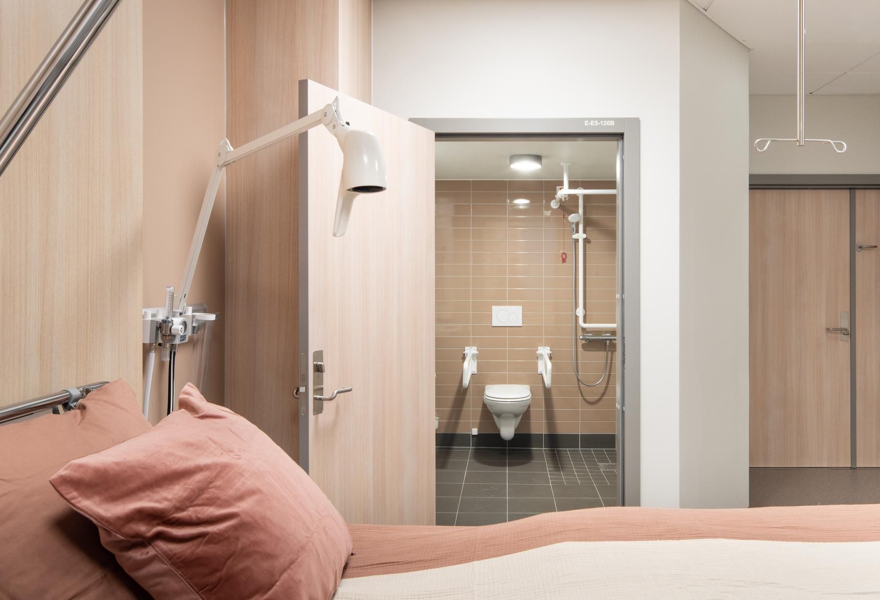 Badet har hev/senk servant og WC, og støttehåndtak er plassert hensiktsmessig i rommet, slik at pasienten selv kan forflytte seg mellom WC, servant og dusj.