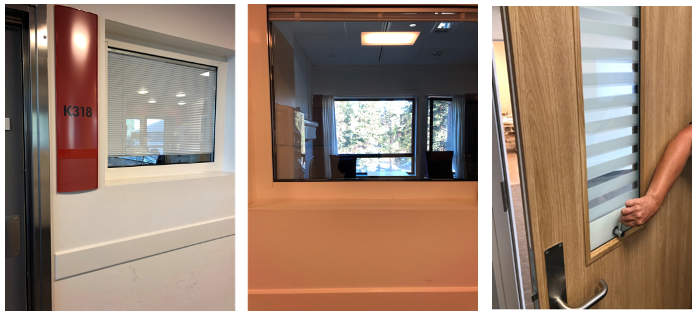 Eksemplet fra Nye Drammen sykehus i figuren over viser hvordan innvendige persienner i glass i dør kan åpnes og lukkes utenfra. Innovative glass med bryter for frosting er også en mulighet.