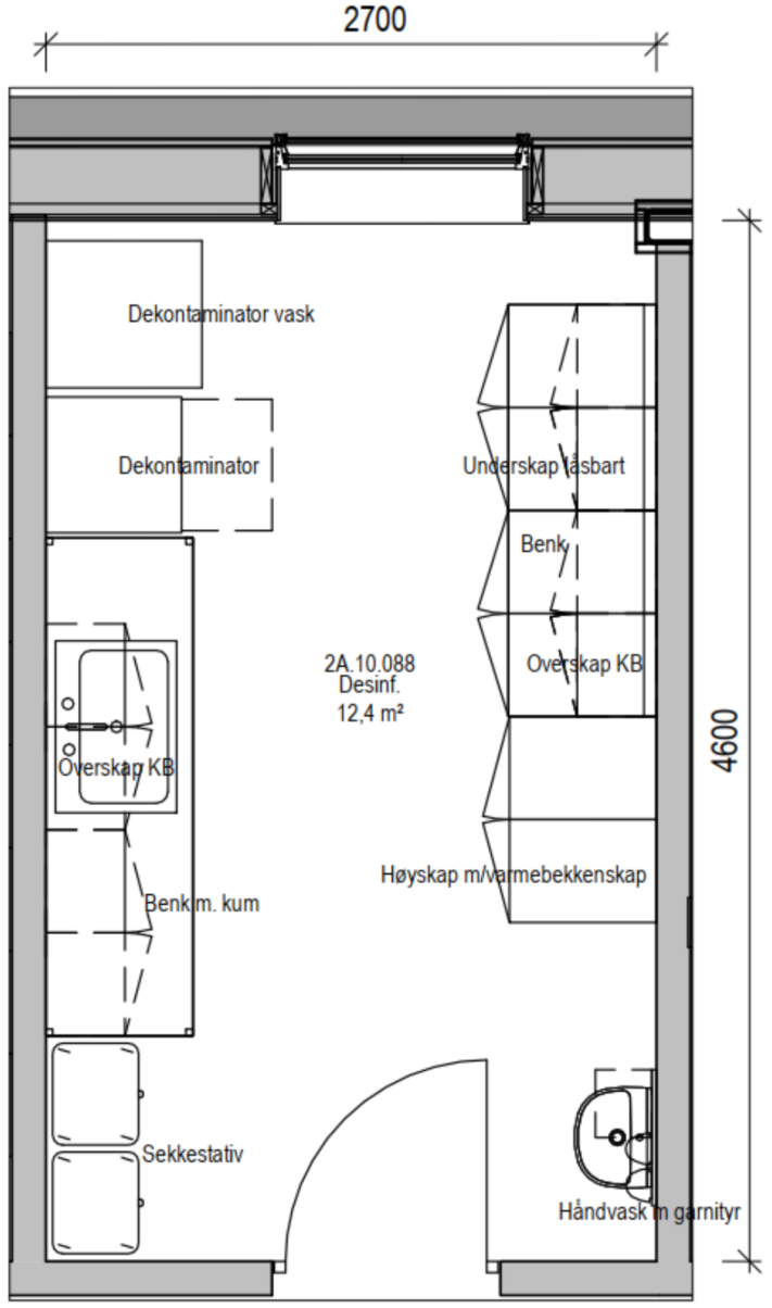 Eksemplet over viser en to-romsløsning for desinfeksjonsrom med et urent rom med gjennomstikk til et rent lager hvor rene vaskefat, bekken m.m. lagres.