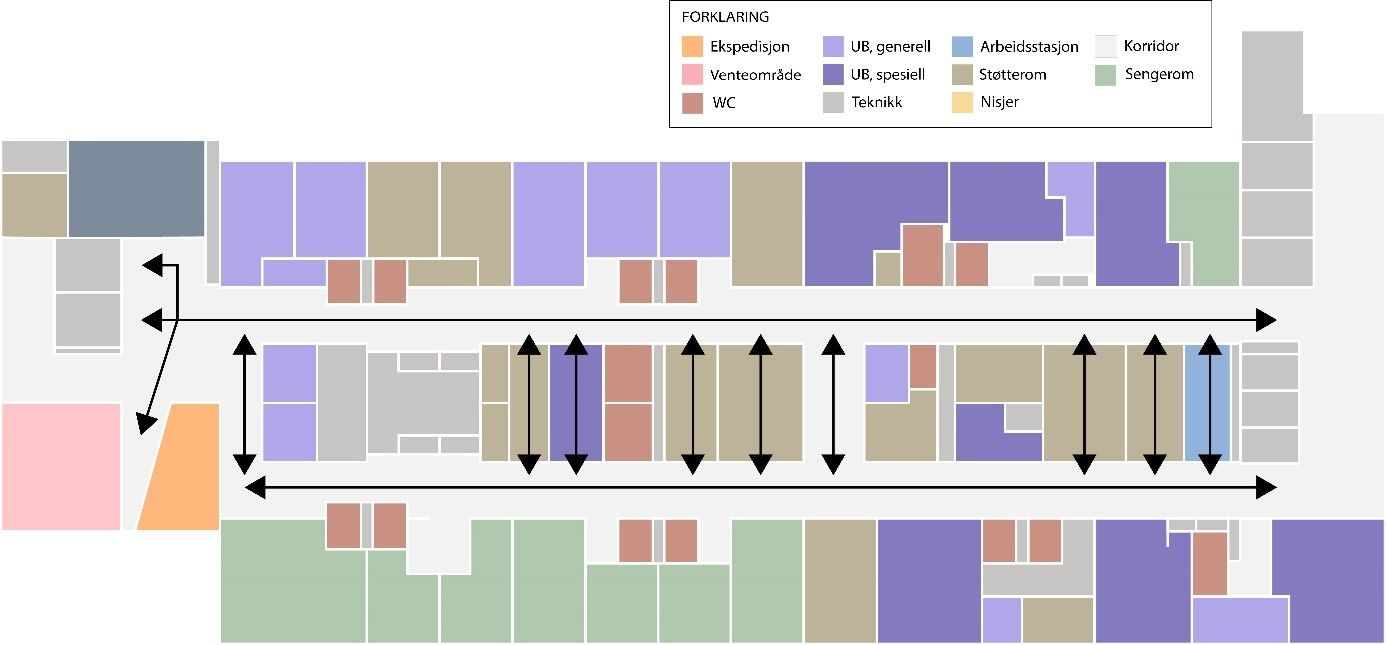Poliklinikkområde A-fløy UNN Tromsø med sone for pasienter og sone for personell. Kilde: Rambøll Arkitekter/PKA 17.06.2016, tilrettelagt av Sykehusbygg HF (2017)