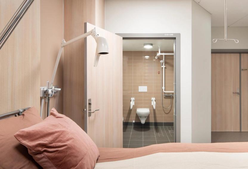 Det nye sengebygget i Tønsberg har standard bad på ca. 5 m2, og større bad på ca. 7 m2. Det er plass rundt toalettet for at bistand kan ytes, og avstanden til servanten er ca. 50 cm, med håndtak på servant for støtte.