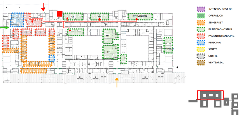 Bildediagnostikk er bygget som en sentralisert modell. CT, konvensjonell røntgen og MR er plassert nært akuttmottaket med intervensjonsfløy i enden av korridoren.