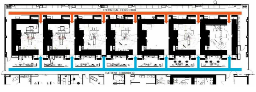 Dette senteret har valgt å plassere strålebunkerne langs en korridor med pasienttilgang markert med blått og teknisk korridor, markert med rødt. Manøverrommene ligger foran hver av behandlingsrommene.