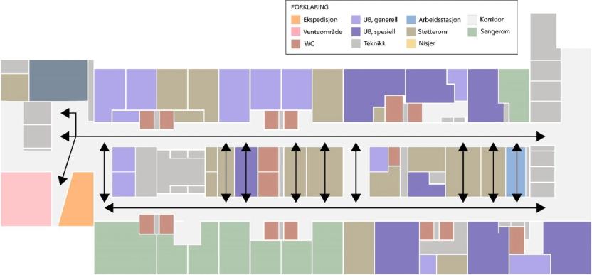Eksempel på dobbelkorridorløsning, hvor UB-rommene er plassert ut mot fasaden med tilgang til dagslys. Støtterommene ligger i midtkjernen og de fleste støtterom kan nås fra begge korridorer.