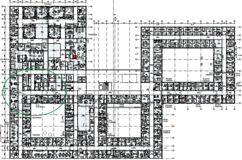 Intensiv er lokalisert på plan 2 med operasjon, post operativ og overvåking. Akuttmottak og bildediagnostikk i plan 1 med akuttheis.