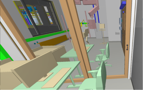 Det er skyvedør med stort glassfelt mellom intensivrommene. Arbeidsplassene er plassert rett ved skyvedøren