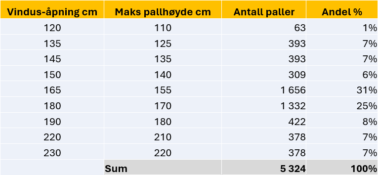 Nedenfor vises eksempel på oppsett over ulike størrelser på palleplasser på Logistikksenter Helse Midt-Norge (før utvidelse for beredskapslager for smittevernsprodukter), som grunnlag for å utarbeide reoldesign.