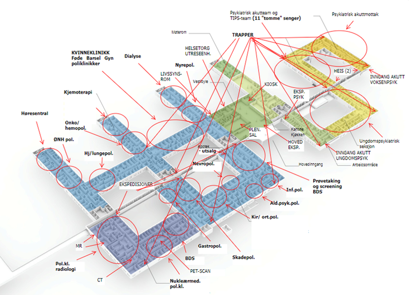 Poliklinikkene har både enkel- og dobbelkorridorløsning (hhv. lokalisert i sengebygget og behandlingsbygget) med inngang fra felles vestibyle med resepsjon, innsjekkingsautomater og pasientverter på plan 1. Hovedkorridoren mellom sengebygg og behandlingsbygg har mye trafikk. Blodprøvetaking og bildediagnostikk er plassert på plan 1 i behandlingsbygget.