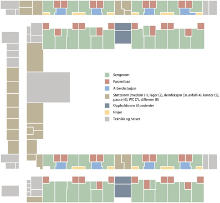 Sengeområdene er plassert i et eget sengebygg over 4 etasjer (plan 2 - 5) og med poliklinikk på plan 1. Et sengeområder er bygd opp av 4 sengetun på rad med de fleste støtterom i den tverrgående forbindelsen per etasje.