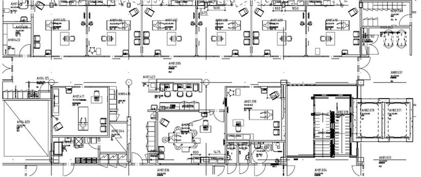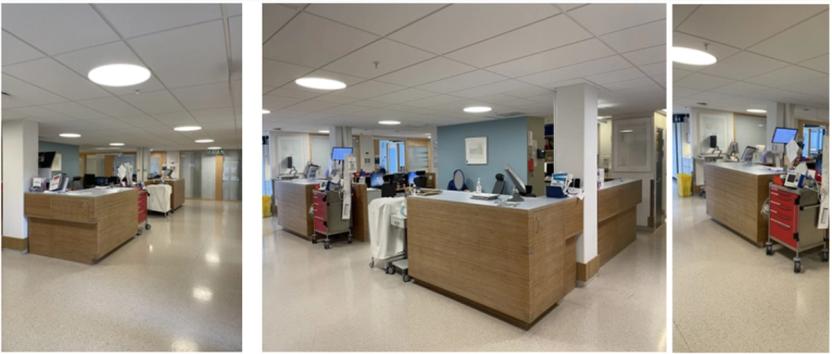 Arbeidsstasjon i korridor er plassert i midtkjernen, og brukes som dokumentasjonsplass for leger og base for tverrfaglig samarbeid. I tillegg har den en funksjon som en uformell møteplass.