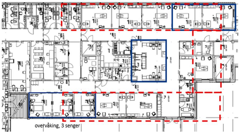Figuren viser arbeidsstasjon med senger plassert rundt. Pasientrommene er utformet etter det samme konsept som Hovedintensiv.