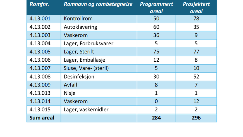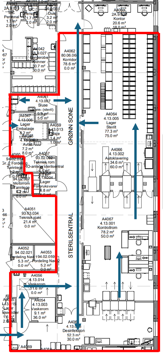 Her vises romprogrammet for sterilsentralen. Grønn garderobe og kontorer deles med operasjonsavdelingen. Sluse for varer benyttes også av operasjonsavdelingen.