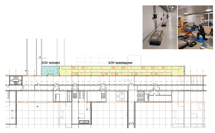 Figuren nedenfor viser AGV-verkstedet og plasseringen i forhold til arealer for lading av AGV’er.