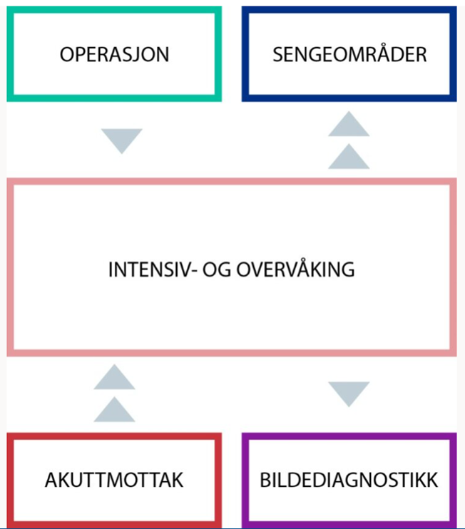 Intensiv og overvåkingsområder (kategori 2 og 3 senger) skal være definerte geografiske enheter i sykehuset. Det bør være horisontal eller uhindret vertikal tilgang til vitale funksjonsområder som: