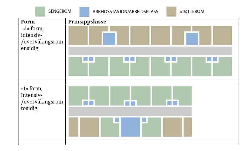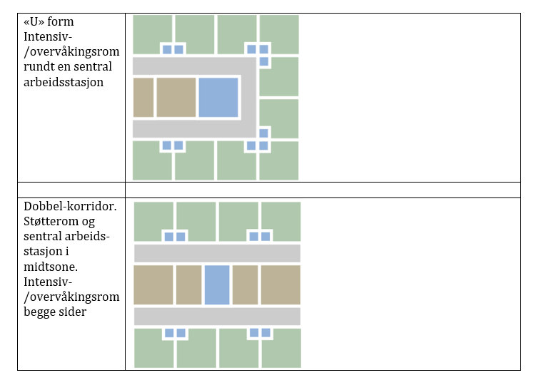 Intensiv- og overvåkingsenheter har hatt en utvikling i løsningskonsepter. Forskning og evalueringer viser at man har gått bort fra store saler med mange intensiv- og overvåkingsplasser, og spørsmålet om plassering av rom og korridorer har stor betydning for fotavtrykket. Selv om det er behov for større areal per plass enn tidligere, er det samtidig ønskelig med kompakte områder med god oversikt over pasienter og ansatte. Samtidig er også behov og Arbeidstilsynets krav til dagslys en faktor som påvirker utformingen. I hovedsak er det valget mellom enkel- og dobbelkorridor, med noen varianter med «U» form og en- eller tosidige løsninger. Disse er vist i prinsippskissene i tabellen under: