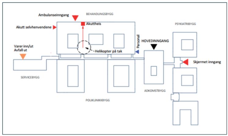 Ambulanseinngangen må ligge nær akutt- og traumerom for å kunne ivareta rask diagnostisering og behandling.