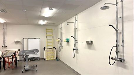 - Uren sone i et oppvarmet rom med dusjer og slange for spyling og fjerning av klær med særlige krav til ventilasjon, trykk og temperatur.