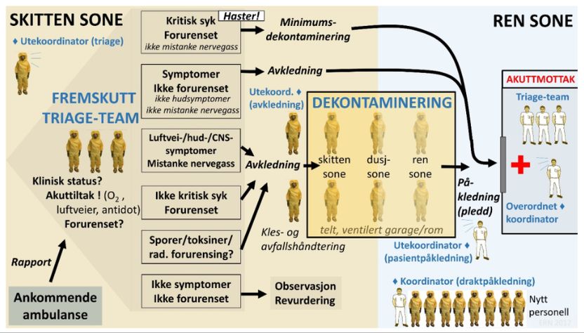 Alle sykehus med akuttfunksjon er forpliktet til å ha beredskap for mottak av CBRNE-pasienter. Kravene er basert på Nasjonal faglig retningslinje for håndtering av CBRNE-hendelser med personskade og sykehuset størrelse (Helsedirektoratet, 2017Nasjonal faglig retningslinje for håndtering av CBRNE-hendelser med personskade https://www.helsedirektoratet.no/retningslinjer/handtering-av-cbrne-hendelser-med-personskade/CBRNE-hendelser%20med%20personskade%20%E2%80%93%20Nasjonal%20faglig%20retningslinje.pdf). CBRNE står for kjemiske stoffer (C), biologiske agens (B), radioaktiv stråling ®, kjernefysisk stråling (N) eller eksplosiver (E).