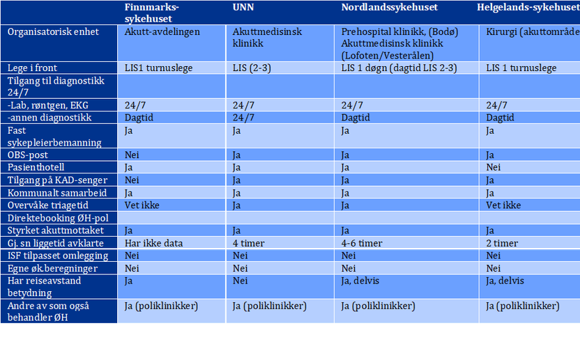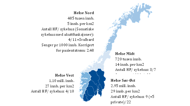 Figuren under viser eksempler på ulikheter i strukturelle forhold innen somatisk spesialisthelsetjeneste mht. antall innbyggere, areal, antall helseforetak/ somatiske sykehus med akuttfunksjoner og senger. Dette gjelder mellom helseregioner, men også internt i hver region. Tilbud og lokalisering av helsetjenester vil kunne avhenge av forhold som infrastruktur, geografi, topografi og klima. Klima, geografiske forhold og topografi kan ikke påvirkes og helsetjenesten må innrette seg etter dette. Infrastruktur er imidlertid i utvikling, med bedre veier, mer stabile fergeruter og fergeløse strekninger har/ får betydning.