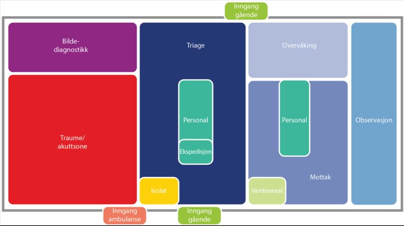 - Triageringssonen inneholder ekspedisjon, triagefunksjon og enkelte mottaksrom. Triageringssalen gir god oversikt for koordinator, men enkelte senger er dårlig plassert. Arbeidsplassene er utsatt for støy og gjennomgangstrafikk, og plasseringen av lege og sykepleier burde vært mer sentral. Resepsjon og venterom er plassert slik at gående pasienter må krysse store deler av mottaket, noe som svekker pasientflyten. Ansatte anser at pasientsikkerheten blir bedre ivaretatt på sal fremfor ensengsrom, da triagesalen er kontinuerlig bemannet. Prioritering av pasientsikkerhet foran personvern er vurdert viktigere i denne sammenheng.