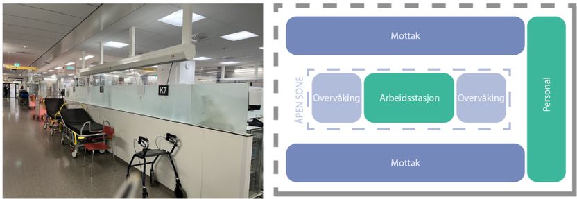 Overvåkingsfunksjonen er løst med en arbeidsstasjon plassert i midtsonen mellom to korridorer, med overvåkingsplasser i hver ende. Dette gir god oversikt og effektiv pasientoppfølging.