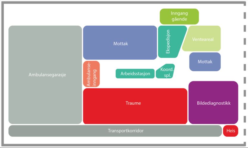 Akuttmottaket har tre traumerom, som hvert kan ta hånd om to til tre pasienter samtidig. Rommene er på 65 m² og vurderes av de ansatte som noe overdimensjonerte. Bildediagnostikk er godt integrert med takhengt røntgen i traumerommet og direkte tilgang til CT.