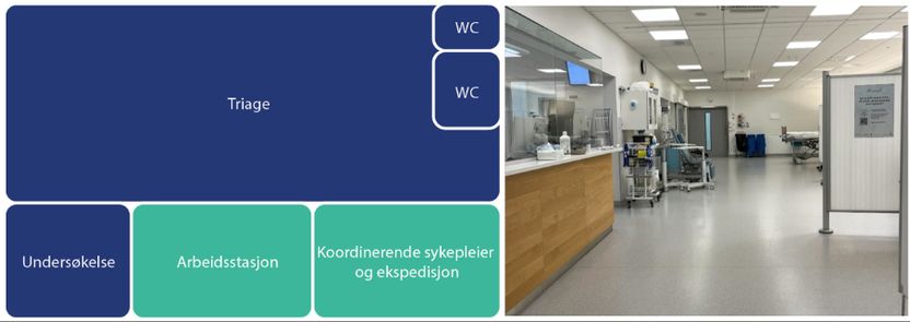 Triagesal akuttmottaket St. Olav hospital HF. Arbeidsstasjonen skimtes helt til høyreFoto: Sykehusbygg HF