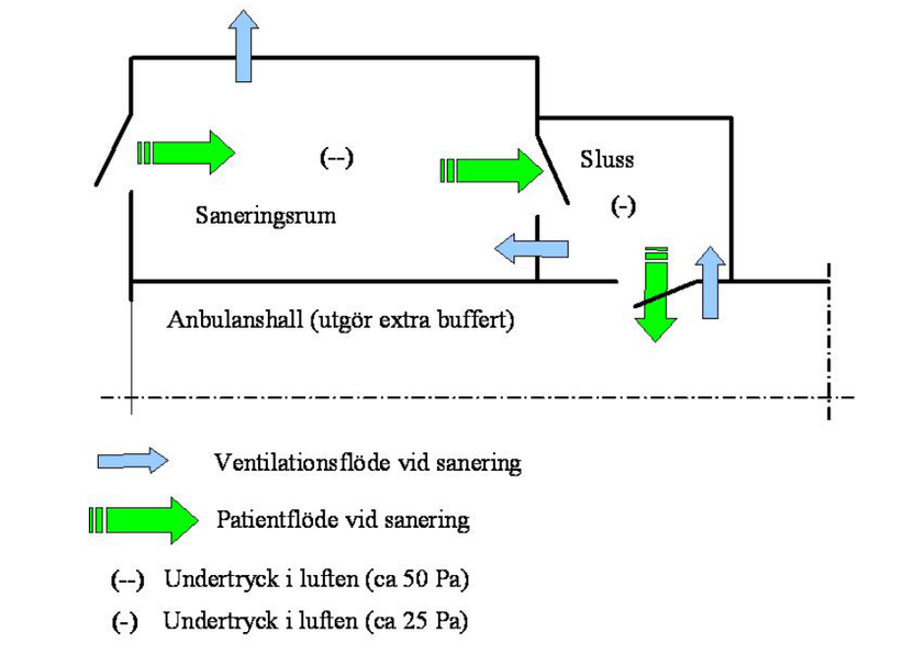 - Ambulansehall og dekontamineringsenheten skal ha et lavere lufttrykk enn selve mottaket, noe som medfører at en evt. lekkasje fra dekontamineringsenheten stopper i sluse og ambulansehall da luft suges fra et rom med høyere trykk mot et rom med lavere trykk.