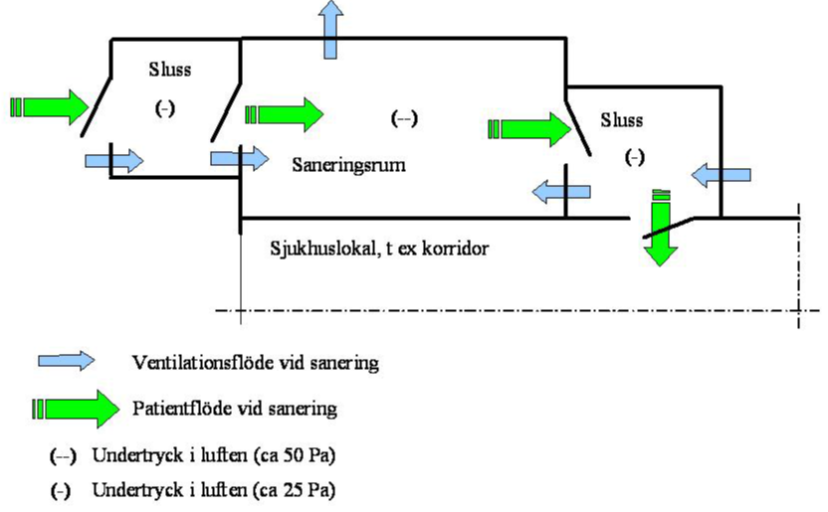 - Under dekontaminering bør ventilasjon kunne gi minst 50 Pa lavere trykk i dekontamineringsrommet enn i ambulansegarasjen eller andre tilstøtende rom. Trykket i slusen bør ligge på ca. 25 Pa.