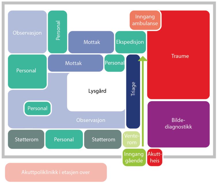 Prinsippskisse over plassering av funksjoner i akuttmottaket St. Olav HospitalIllustrasjon: Sykehusbygg HF
