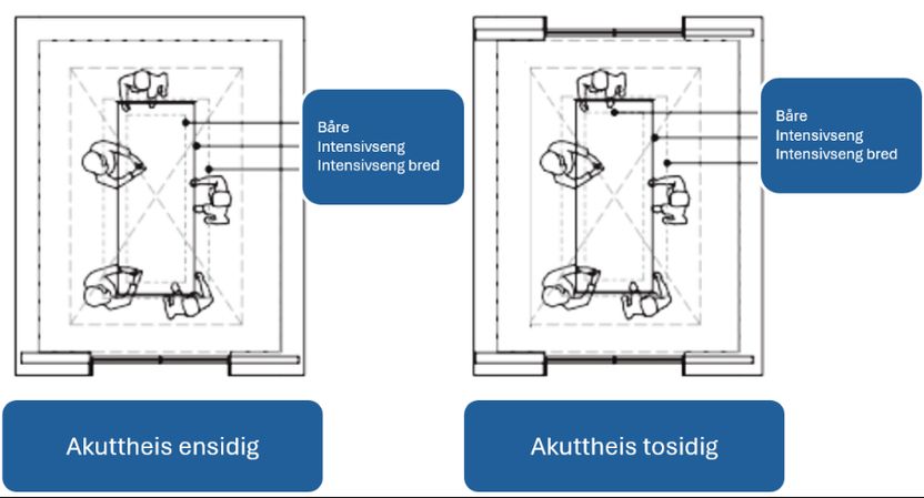 Sykehusbygg anbefaler dimensjonene som er benyttet ved Sjukehuset Nordmøre og Romsdal samt Nye Rikshospitalet.