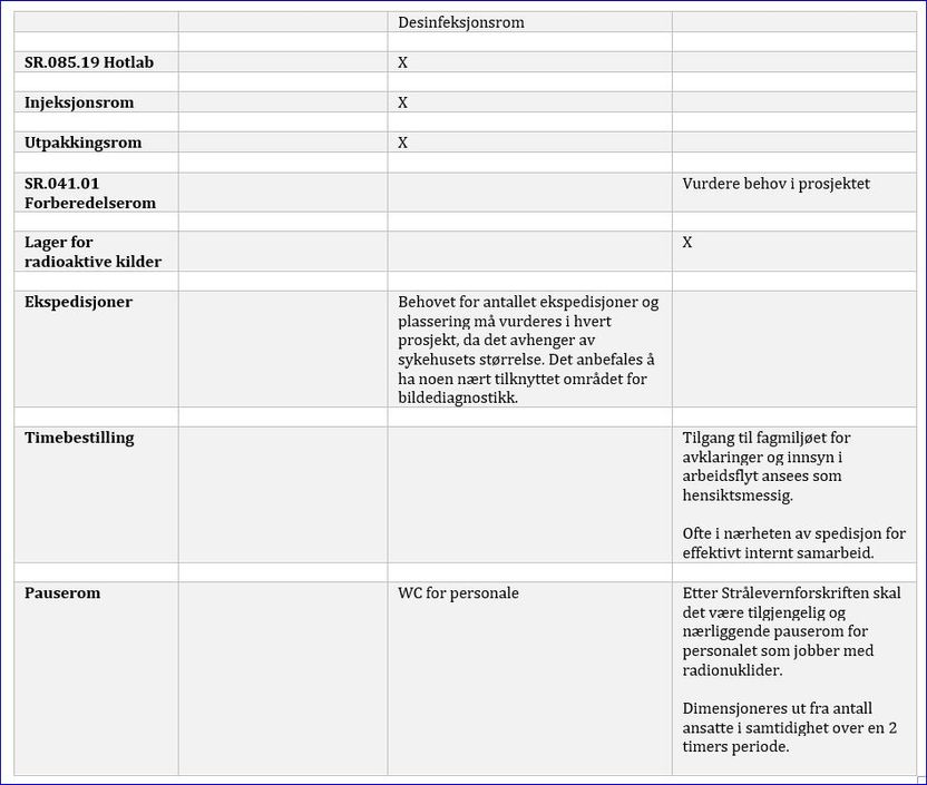 • Avhengig av type sykehus og aktivitet kan det kan også være andre behov som ikke er dekket som vist i i kapittel Nærhetsbehov støtterom knyttet til radiologi/Tabell nærhetskrav støtterom radiologi.