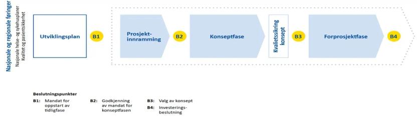I planlegging av sykehus er det anbefalt at alle prosjekter bør følge Veileder for tidligfasen i sykehusbyggprosjekter (Sykehusbygg, 2017).Veileder for tidligfasen i sykehusbyggprosjekter.. Hentet November 10, 2019 fra https://www.helse-sorost.nohttps://www.helse-sorost.no/Documents/Styret/Styrem%C3%B8ter/2017/20170914/088-2017%20Vedlegg%20-%20Veileder%20for%20tidligfaseplanlegging%20i%20sykehusprosjekter.pdf Denne er inndelt i faser og beslutningspunkter (merket i gult), vist i figur 1.