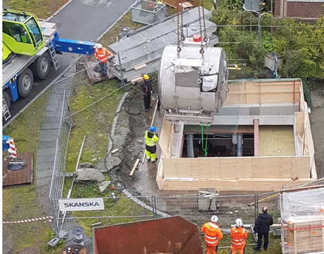 MR rom bør plasseres mot yttervegg. Det gir enklere mulighet for inn- og utlasting av svært tungt utstyr. Ved plassering inn i et bygg må det planlegges med egnet transportvei. Ett eksempel er vist i bilde 1 med innlasting av 7 Tesla MR ved St. Olavs hospital HF.