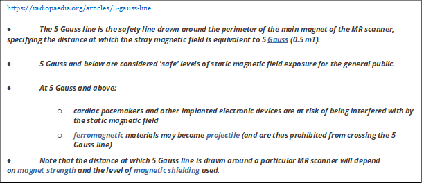 5 Gausslinjen er en sikkerhetslinje og skal være innenfor MR laboratorium (sone 4), se figur 2, og som varierer med magnetfeltstyrken. Personalets arbeidsplass skal være utenfor 5 Gausslinjen.