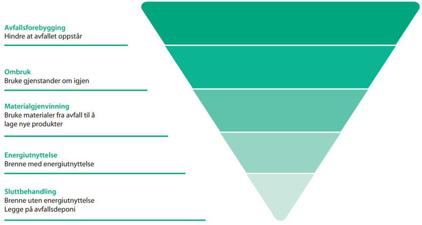 Avfallspyramiden består av 5 nivåer, listet i prioritert rekkefølge: avfallsforebygging, ombruk, materialgjenvinning, energiutnyttelse og sluttbehandling.