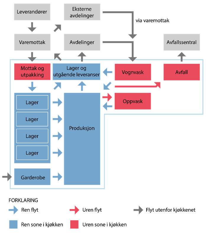 Nedenfor vises en prinsippskisse for soner med rom og vareflyt i sentralkjøkken.