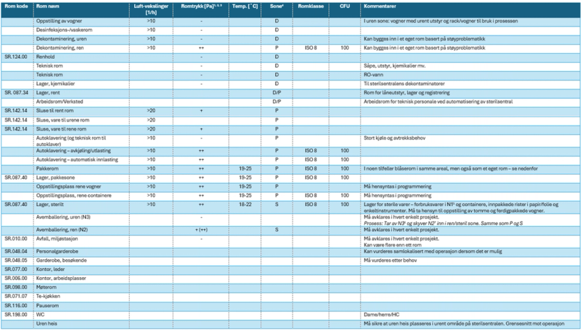 I tabellen nedenfor vises en oversikt over rom og arealer med tekniske krav til rommene.