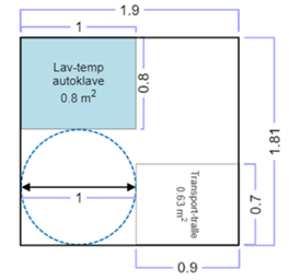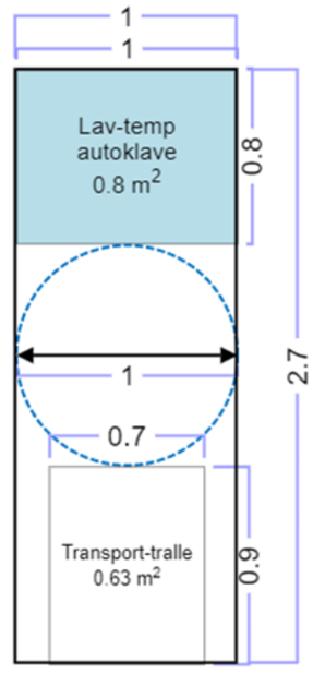 Instrumenter som ikke tåler høy temperatur ved autoklavering, må steriliseres i en egen lavtemperaturautoklave. Det vil kreve et areal for å kunne bringe instrumentene i direkte nærhet til autoklaven, med eksempelvis en transporttralle. Utforming av cellen er illustrert på to måter, som gir et ulikt areal. Forskjellen er om transporttrallen bringes inn på siden eller i front av autoklaven.