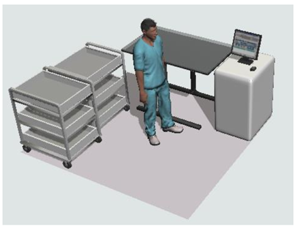 Cellen for kontrollering av vaskede brikker/enkeltinstrumenter består av ett arbeidsbord, et eget bord for PC og skriver, og plass til å ta med seg transporttraller helt opp til arbeidsbordet, illustrert i figuren. Arbeidsbordet måler 1.8 m x 0.8 m som minstekrav for god plass til å utføre arbeidet. Et arkivsystem for brikkeoppfølging må være lett tilgjengelig over bordet. Systemet må nåes ved arbeid foran bordet og bør fordelaktig plasseres i et hyllesystem. Cellen er illustrert i 3D for å tydeligere vise romfølelse.