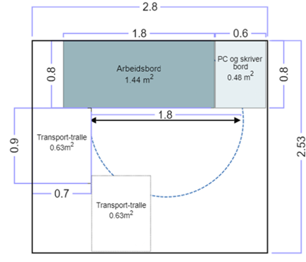 Bevegelsesrekkevidde på 1.80 m er lagt til grunn ved planlegging av cellen. Den fulle dybden på 2.35 m må ikke opprettholdes, men arbeider skal kunne bevege seg komfortabelt og enkelt flytte på traller innad i cellen.