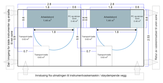 I følge St. Olavs Hospital vil det være behov for minst to arbeidsceller kontrollsone. Årsaken er at en tunellvaskemaskin produserer rent utstyr hvert 22.5 minutt, krever det høy nok kapasitet ved kontrollsonen til å kunne ta imot instrumentene som kommer fra instrumentvaskemaskinene. Figuren viser et eksempel på hvordan to celler kan settes sammen, samt hvor flyten av instrumenter og vaskeinnsatser går.