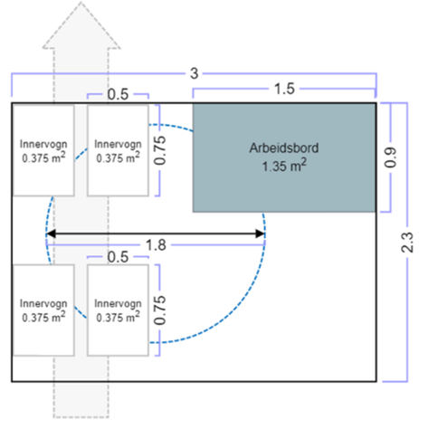 Avstanden mellom innervognene bør opprettholdes så operatør kan bevege seg mellom dem. Ved bevegelsesrekkevidde på 1.80m kan operatør nå vognene uten å måtte forflytte seg langt unna arbeidsbordet. Se Figur 55 for 3D-modell av cellen som viser plassen den ansatte beveger seg på.