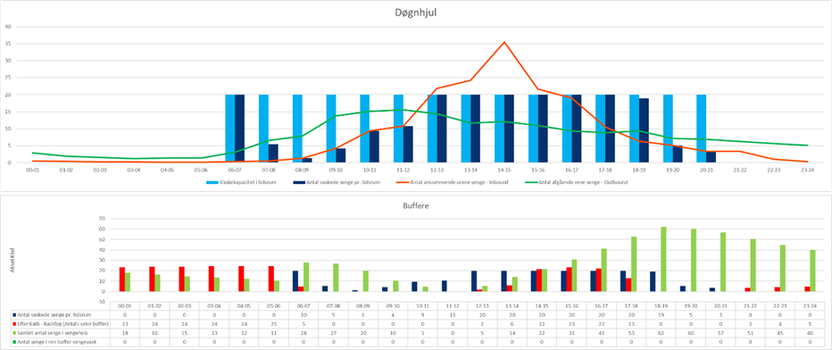 • I nederste del av figuren (stolpediagrammet) er det informasjon om antall vaskede senger, etterslep på vask, antall senger i sengelagerheis og antall senger på sengevasksentral (den samme forklaringen gjelder for 2-skiftordningen nedenfor).