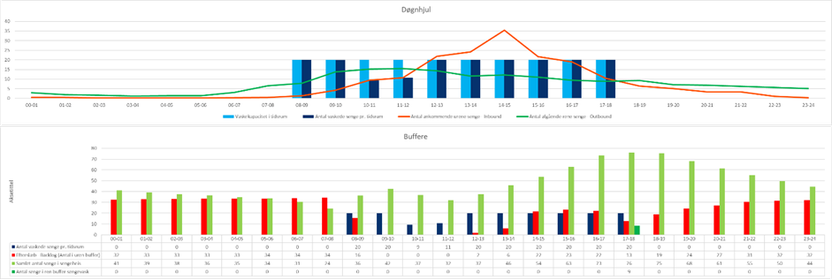 Når antall senger som skal skiftes ut pr. døgn er kartlagt er det viktig å skaffe seg en oversikt over tidspunktet for når på døgnet utskriving og innleggelse av pasienter skjer, se eksempel i Tabell 2. Dette vil gi en god oversikt for å dimensjonere kapasiteten på sengevaskmaskinen og nødvendig areal for lager og bufferareal for urene og rene senger/utstyr. Bufferareal benyttes for å håndtere kø foran og etter en prosess.