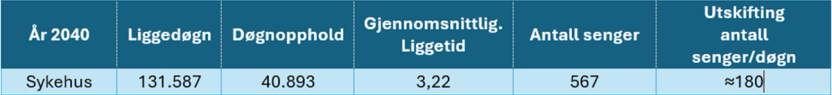 Fremskrevet aktivitet for liggedøgn og antall senger 2040 – eksempel hentet fra MjøssykehusetKilde: Sykehusbygg HF