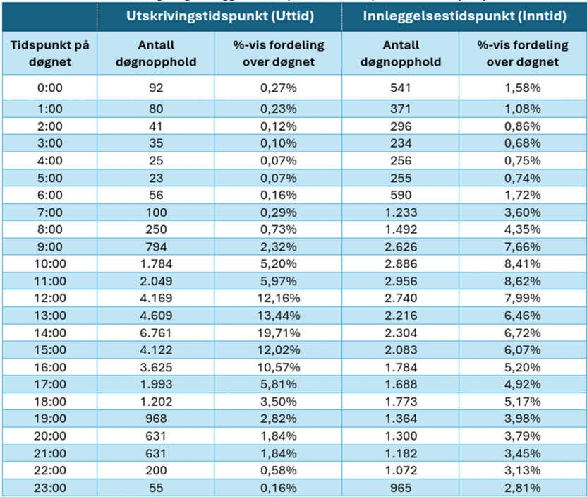 Utskrivings- og innleggelsestidspunkt – eksempel hentet fra MjøssykehusetKilde: Sykehusbygg HF