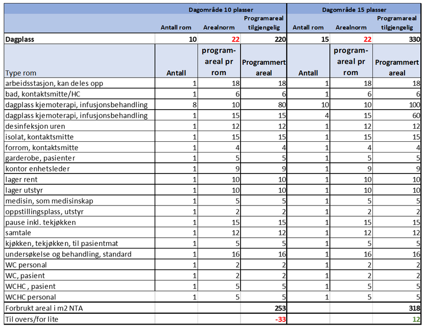 Under vises et eksempel på et romprogram for to dagområder for infusjonsbehandling og kjemoterapi. Eksemplene viser at det enklere å komme innenfor arealrammen med flere dagplasser samlet, da en mindre enhet har behov for de samme støtterommene. Eksemplet med 10 dagplasser må ha en arealnorm på 25 m2 for å komme innenfor arealrammen.
